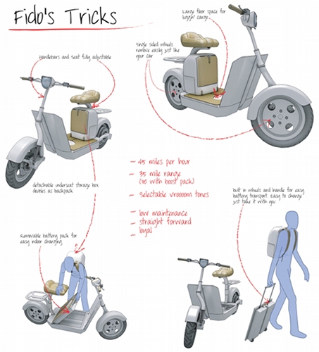 Enfin, le Fido se devait d’être confortable, facile à conduire et valorisant. Le dessin fait dans l’épure et avec sa couleur blanche, il rappelle les produits de la marque à la pomme. Ses roues dégagées devraient lui permettre une maintenance facile. Le tablier avant rappelle fortement la mythique Vespa et le châssis apparent le Zoomer de Honda.