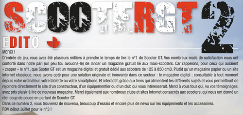 Non, car la particularité du magazine « Scooter GT » est qu’il est consultable en ligne et qu’il se feuillette comme un magazine papier. Une double particularité donc et quand vous saurez que le magazine est totalement gratuit, vous comprendrez la performance.