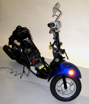 La première étape consista à déshabiller littéralement le scooter jusqu’au cadre. Presque toutes les parties du scooter ont été retravaillées afin de pouvoir intégrer tous les gadgets prévu dans le projet.