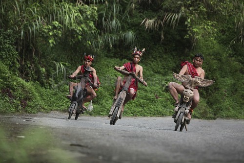 Durant le festival Umbayah, les scooters de bois passent à la compétition tandis que les conducteurs revêtent leurs costumes ethniques. Ce sera leur seule protection.