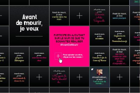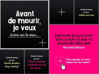 Le principe est de laisser s’exprimer les internautes sur un mur virtuel. Chacun peut ainsi écrire son vœu, son souhait, un rêve qu’il a de plus cher avant de mourir. « Avant de mourir, je veux être heureuse dans la vie », « Avant de mourir, je veux avoir deux enfants avec Benoist »,… certains rêves sont très sages, d’autres plus farfelus.