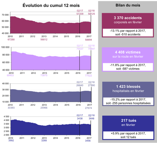 - 4.191 personnes ont été blessées en février 2018 contre 4.790 en février 2017, soit 599 de moins (-12,5%) ;