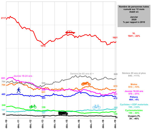 En janvier 2020 en France métropolitaine, selon les estimations de l’Observatoire national interministériel de la sécurité routière (ONISR), 260 personnes sont décédées sur les routes, contre 237 en janvier 2019 soit 23 personnes tuées en plus (+9,7%).