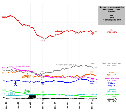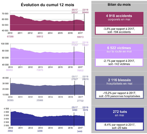 - le nombre d’accidents corporels est de 4 918 contre 5 112 en mai 2017, soit 194 accidents corporels de moins (-3,8%) ;