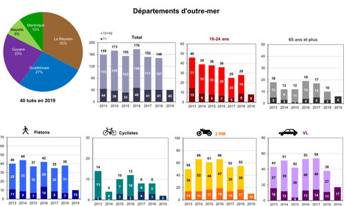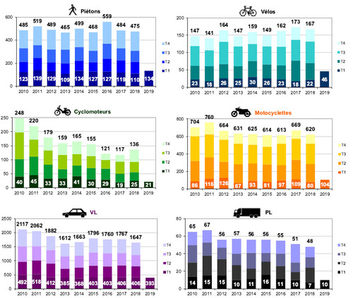Les estimations du premier trimestre 2019 font apparaître que la mortalité routière serait en hausse en agglomération (241 tués contre 211 en moyenne sur cinq ans soit 30 de plus) ainsi que sur le réseau autoroutier (77 tués contre 51 en moyenne sur cinq ans soit 26 de plus). La mortalité sur les routes hors agglomération serait en baisse (423 tués contre 446 en moyenne sur cinq ans soit 23 de moins).