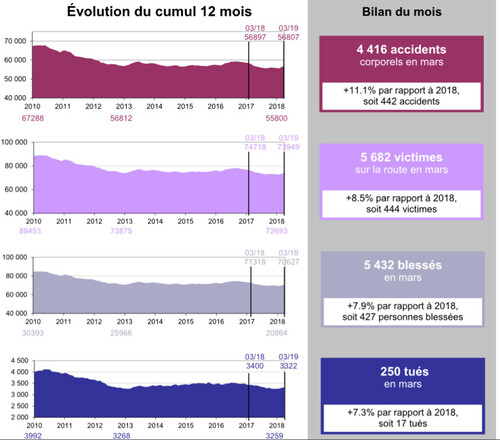 En mars 2019, selon les estimations provisoires de l’Observatoire national interministériel de la sécurité routière (ONISR), 250 personnes sont décédées sur les routes, contre 233 en mars 2018 soit 17 personnes tuées de plus (+7,3%). Les autres indicateurs sont également en hausse :