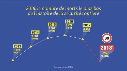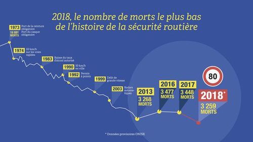 Selon les estimations provisoires de l’Observatoire national interministériel de la sécurité routière (ONISR), 3 259 personnes ont perdu la vie sur les routes de France métropolitaine en 2018. Avec 189 décès de moins qu’en 2017, la mortalité routière de l’année 2018 est en baisse de 5,5 % et de 0,3 % par rapport à 2013, jusqu’alors meilleure année de référence.