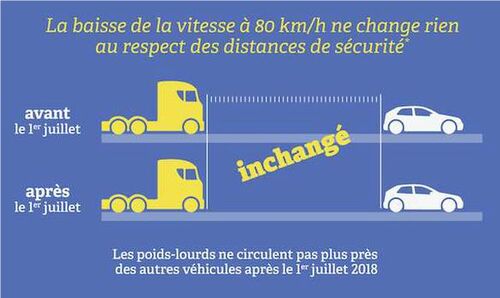 - Les inter-distances entre poids-lourds et voitures sont inchangées. L’effet redouté par certains d’une accumulation de voitures derrière les poids-lourds, ou de voir des poids-lourds coller les automobilistes ne s’est pas produit. Les observations sur le terrain montrent une constance des comportements routiers avant et après la mise en place de la mesure d’abaissement à 80km/h. Aucun « effet de peloton » n’a donc été constaté.