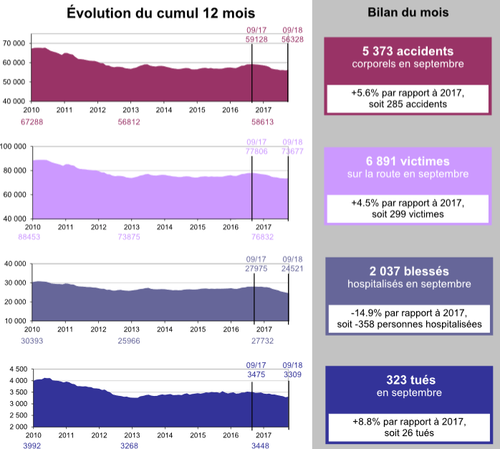 - le nombre d’accidents corporels est de 5 373 contre 5 088 en septembre 2017, soit 285 accidents corporels de plus (+5,6%) ;