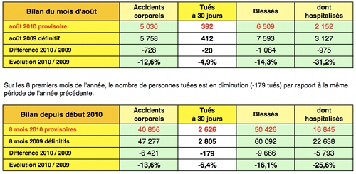 En août 2010, la mortalité routière est ainsi en baisse par rapport à août 2009 (-4,9 %).