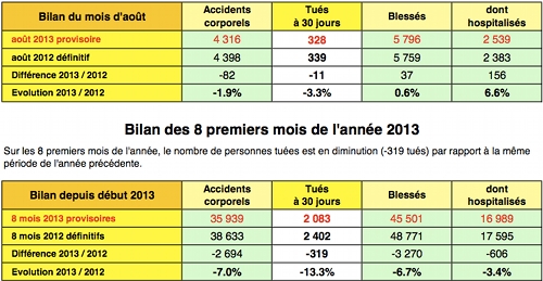 Sur les douze derniers mois (de septembre 2012 à août 2013), comparés à la même période (septembre 2011 à août 2012), le nombre de personnes tuées s’élève à 3 334. Ce sont donc 395 vies qui ont ainsi été épargnées.