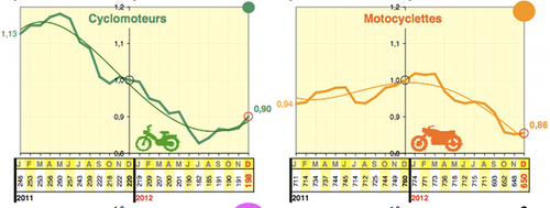 La mortalité des cyclomotoristes cumulée sur les douez derniers mois poursuite la hausse amorcée depuis août avec +4% en décembre 2012 par rapport à novembre 2012. Le bilan de leur mortalité sur 2012 reste cependant très favorable