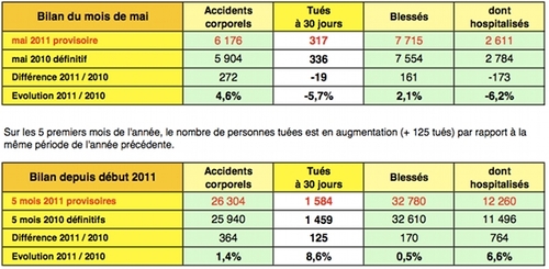 Cependant, la mortalité des motocyclistes est en hausse (+10% par rapport à mai 2010). La baisse porte essentiellement sur les voitures particulières (15%).