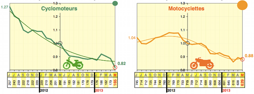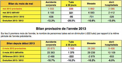 Tous les autres indicateurs sont également à la baisse : le nombre d’accidents corporels passe de 5 193 accidents en mai 2012 à 4 555 en mai 2013, soit une baisse de -12,3%. Le nombre de personnes blessées suit aussi le même mouvement : 5 892 en mai 2013 contre 6 593 en mai 2012, soit 701 personnes blessées en moins (-10,6%).