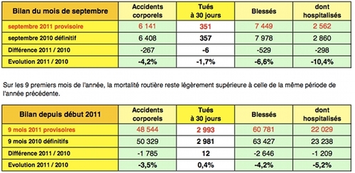 En septembre 2011, 351 personnes ont perdu la vie sur les routes de France contre 357 en septembre 2010, soit 6 personnes tuées en moins, ce qui représente une baisse de 1,7 %.