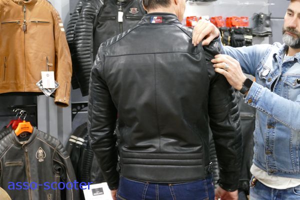 Forte inspiration du fameux Perfecto, le Gomore reprend le montage du zip central décalé, mais en conservant un col court moto classique pour être plus confortable au porté ouvert.