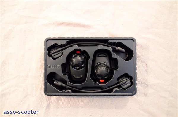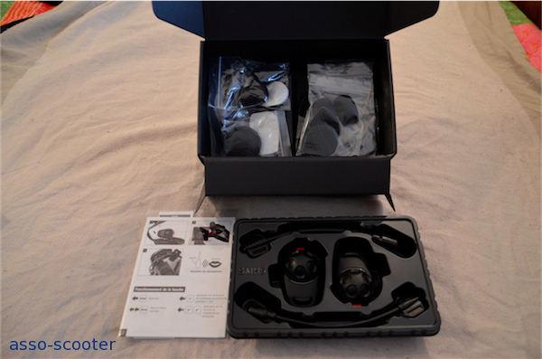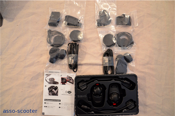 La boite du Sena Smh5 est d’une taille beaucoup plus réduite que celle du Smh10. A l’intérieur, sur le premier plateau, toute la partie sensible est disposé dans des alcôves avec le boitier proprement dit et le micro. Les manuels sont là. En dessous du plateau, tous les éléments de fixation et de connexion sont également disponibles. Par rapport au Smh10, il manque la prise secteur, la prise allume-cigare et le câble jack-jack. Pour le reste, tout est en double.