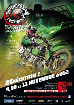Le Supercross de Bercy se déroulera du 09 au 11 novembre 2012 et cette année fêtera sa 30ème édition. Les meilleurs pilotes viendront s’affronter sur la piste dont Christophe Pourcel, Justin Brayton, Eli Tomac, Cédric Soubeyras... Il faudra ouvrir l’oeil pour ne rien rater du spectacle, d’autant que le Supercross de Bercy est également ouvert à d’autres disciplines comme le FMX, le freestyle motocross.