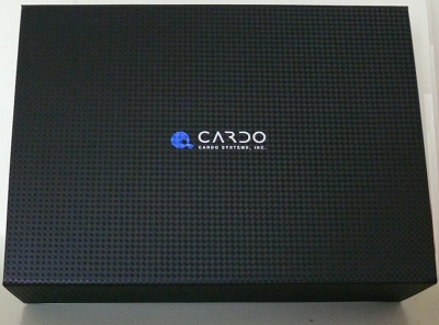 Le Q2 se présente sous la forme d’une boite de 24x17x8. L’étui extérieur retiré laisse découvrir une boite à l’aspect doux simplement marquée « Cardo - Cardo Systems Inc. » . C’est sobre et classe.