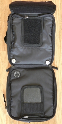 Le deuxième rangement est certainement le plus « complexe ». Il comporte deux languettes rigides qui viennent se coller l’une sur l’autre à l’aide de bande Velcro et assure ainsi à la sacoche et donc au Gps une plus ou moins grande orientation vers le conducteur. Deux pastilles aimantées permettent au rabat d’être maintenu en position fermée.
