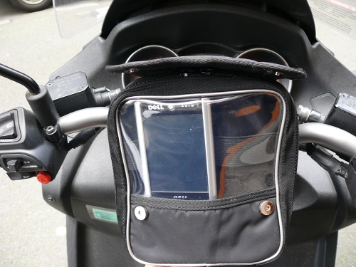 Sur un scooter, sans réservoir, la sacoche Touareg de Bagster se met naturellement en position verticale et cette position ne facilite pas la lecture de l’écran Gps. Si en plus, le rangement central est déployé comme sur une moto, l’écran se retrouve à faire face au réservoir.