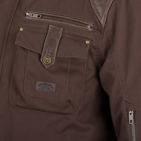 L’utilisation de Serica, tissu souple et résistant à l’abrasion, confère à la veste un aspect extérieur patiné pour un rendu des plus premium. Elle est également identifiable grâce à des empiècements en cuir Buffalo présents aux épaules, aux poches et sur les serrages taille qui participent au caractère exclusif de cette veste.