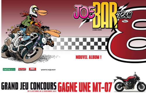 Pour fêter la sortie du huitième album du Joe Bar Team, YAMAHA et les Éditions Glénat organisent le jeu concours « Gagne une moto MT-07 2014 ». Pour participez, c’est très simple, il suffit de répondre à trois questions. Le site propose même des indices. Vous n’avez donc aucune excuse !