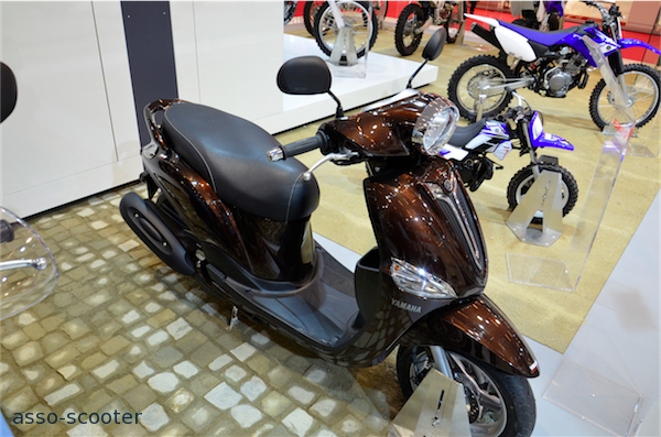 Sur le stand Yamaha, un Xenter bleu du plus bel effet. A ses côtés, un D’Elight marron.