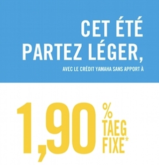 Chez Yamaha, l’été sera léger, léger. Yamaha propose en effet un taux exceptionnel de 1.90% pour l’achat d’un scooter ou d’une moto.