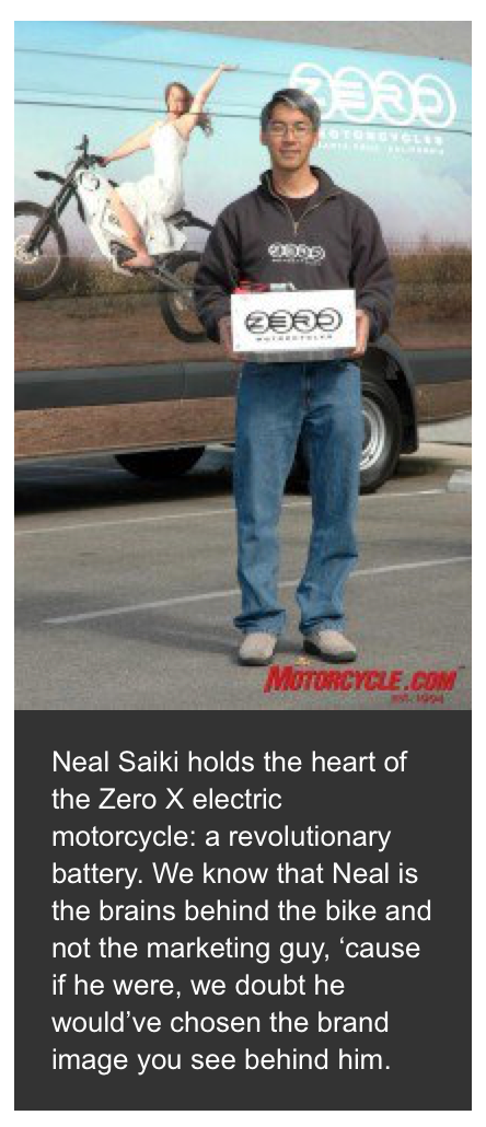 Zero Motorcycles a été fondée en 2006 à Santa Cruz, en Californie, par Neal Saiki, un passionné de motos, ingénieur aéronautique et pionnier. L’entreprise s’appelait alors « Electricross ». Le patrimoine de la société inclut maintenant une technologie de pointe, ainsi qu’une expertise dans la production des motos électriques.